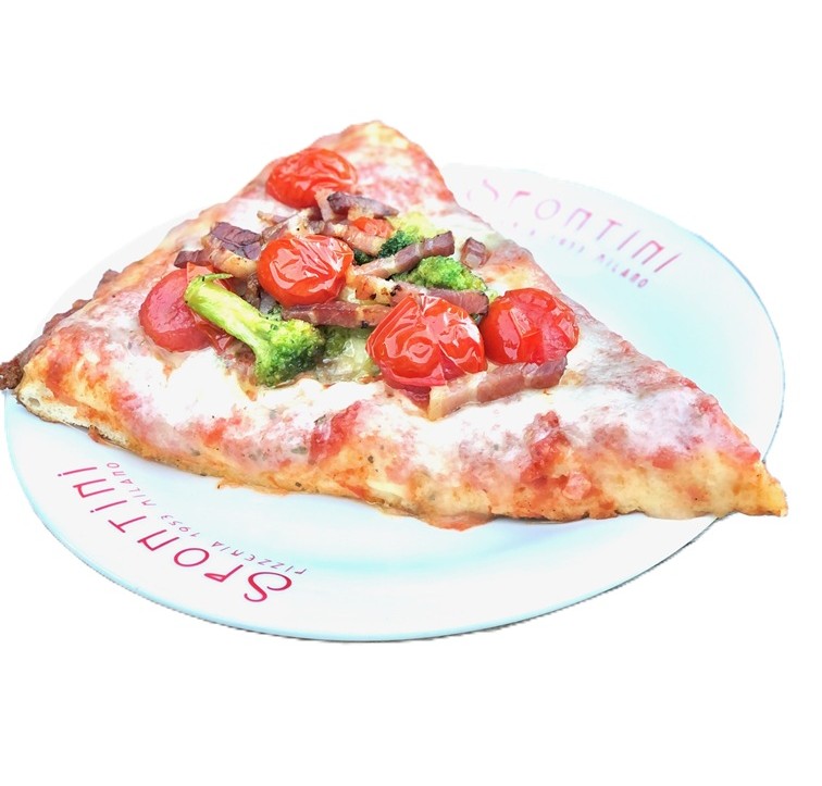 スポンティーニの分厚い生地に、パンチェッタ・ミニトマト・ブロッコリーを